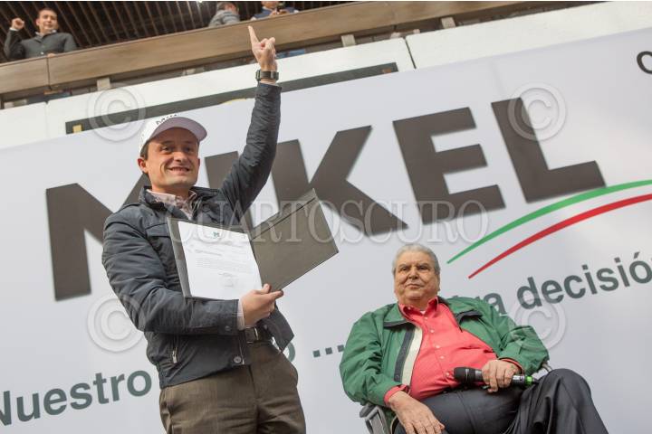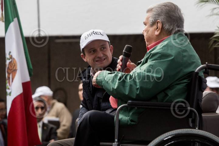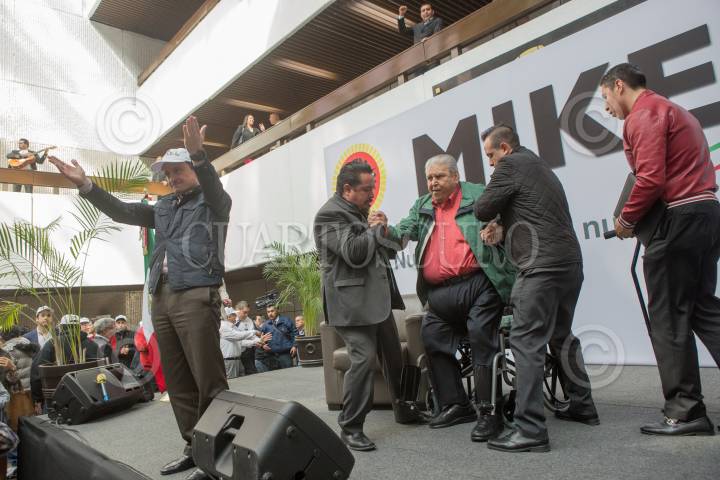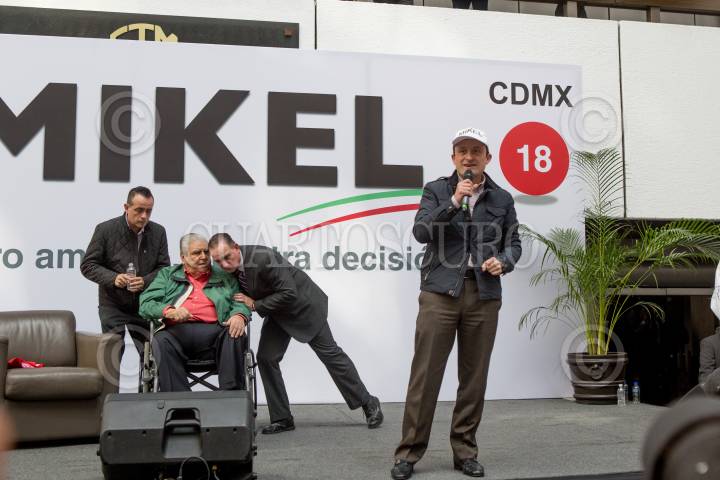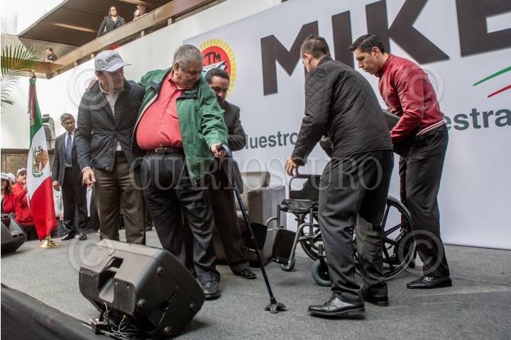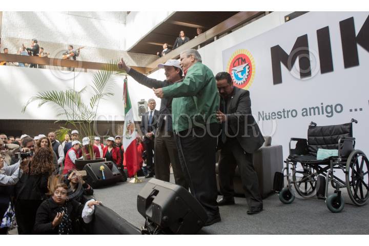 CIUDAD DE MÉXICO, 08DICIEMBRE2017.- Mikel Arriola, candidato por el PRI para la gubernatura de la Ciudad, se presentó por la mañana en las oficinas de la CTM y fue recibido por el líder Carlos Aceves del Olmo. En el evento el sector de los trabajadores mostraron su apoyo al candidato. En la imagen, un empleado de Carlos Aceves lo sostiene por detrás para poderlo mantener de pie junto a Mikel Arriola. FOTO: TERCERO DÍAZ / CUARTOSCURO.COM