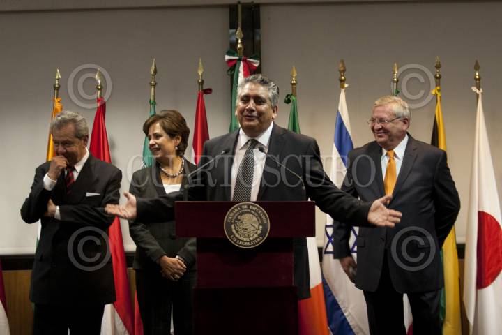 MÉXICO, D.F., 08FEBRERO2011.- Porfirio Muñoz Ledo, Diputado del PT, Patricia Espinosa Cantellanos, titular de la Secretaria de Relaciones Exteriores, Guadalupe Acosta Naranjo, Presidente de la Mesa Directiva de la Cámara de Diputados y Valery Morozov Embajador de Rusia en México, durante la recepción del Cuerpo Diplomático Acreditado en México en las instalaciones de la Cámara de Diputados. FOTO: GUILLERMO PEREA/CUARTOSCURO.COM