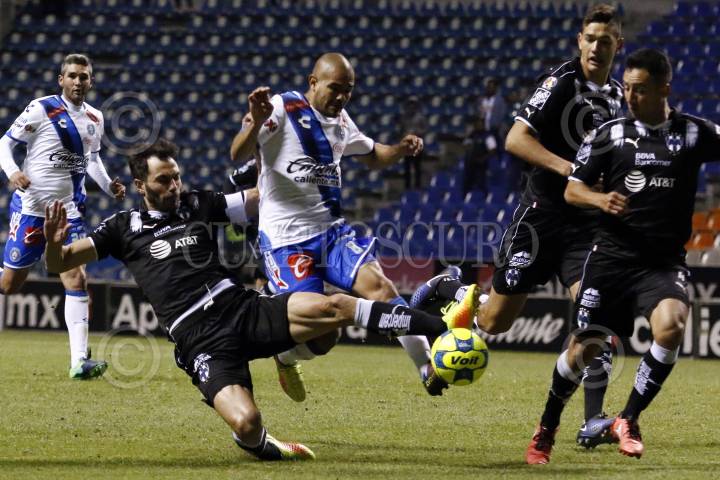 PUEBLA, PUEBLA, 08ENERO2017.- Los jugadores Javier Acuña y José María Basanta disputan el balón durante jugada del partido entre los el Club Puebla y los Rayados de Monterrey correspondiente a la jornada 1 del torneo de clausura 2017 de la Liga MX con marcador final de 2-3 a favor de los visitantes, celebrado en el estadio Cuauhtémoc. FOTO: HILDA RÍOS /CUARTOSCURO.COM