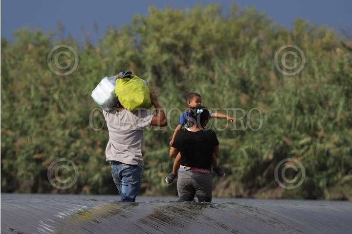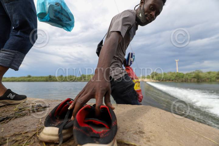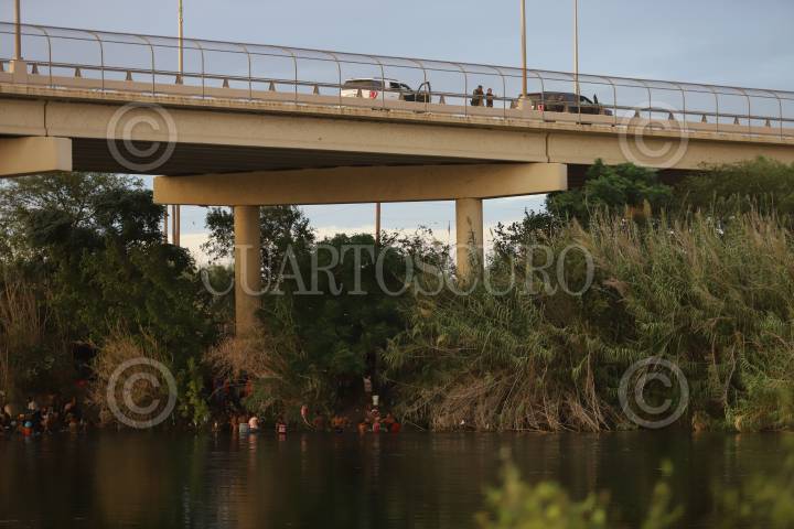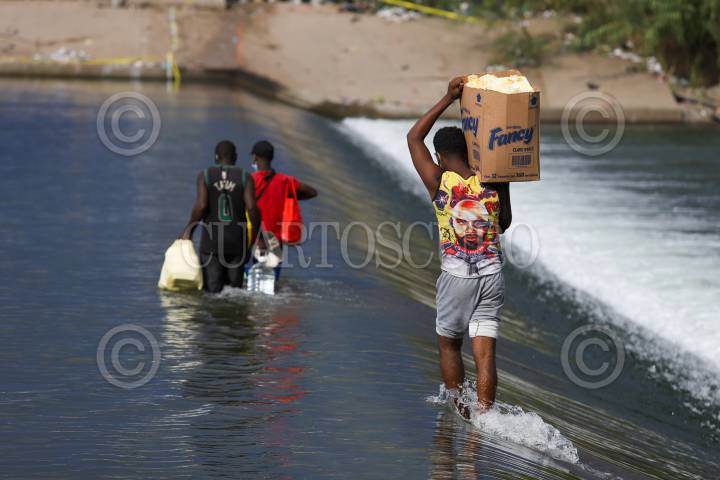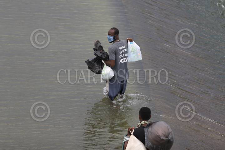 Continúa el éxodo de migrantes haitianos a través del río Bravo, tras lograr cruzar se instalan en un campamento que acondicionaron debajo de un puente de lado de Texas, en donde sos resguardados por elementos de la Border Patrol.