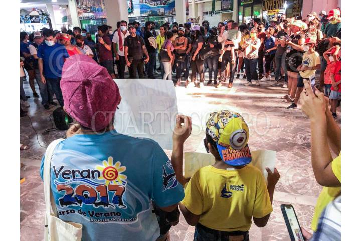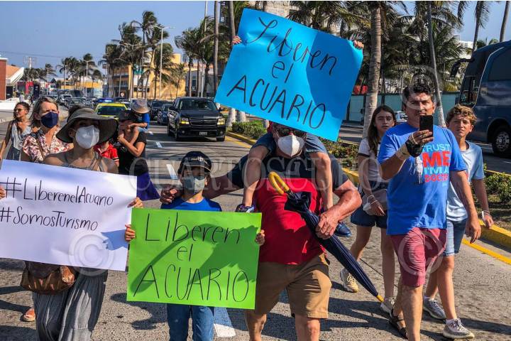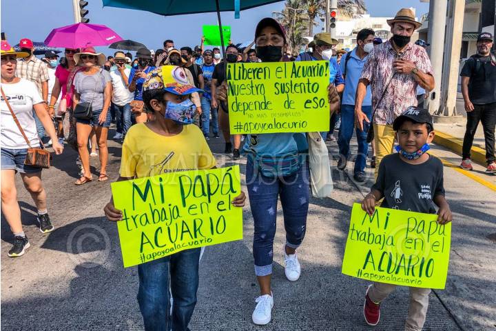 Trabajadores acompañados de sus hijos se manifestaron por la clausura del Acuario de Veracruz.