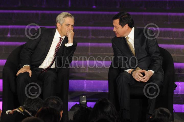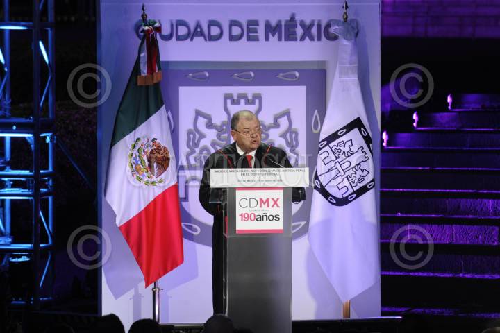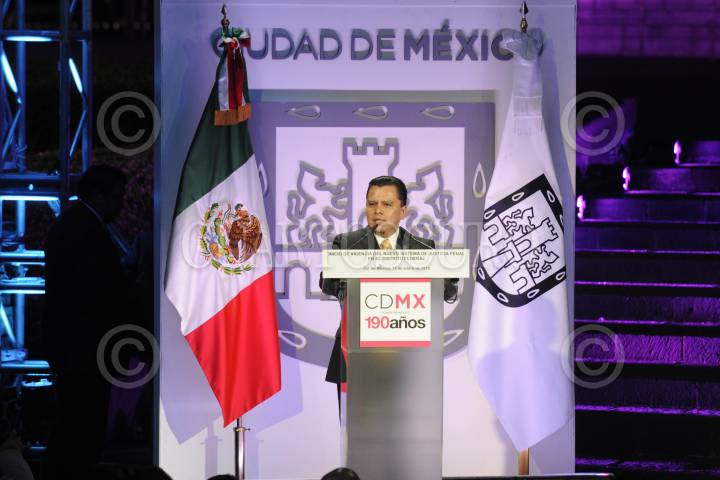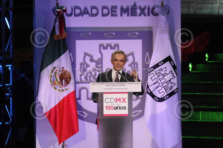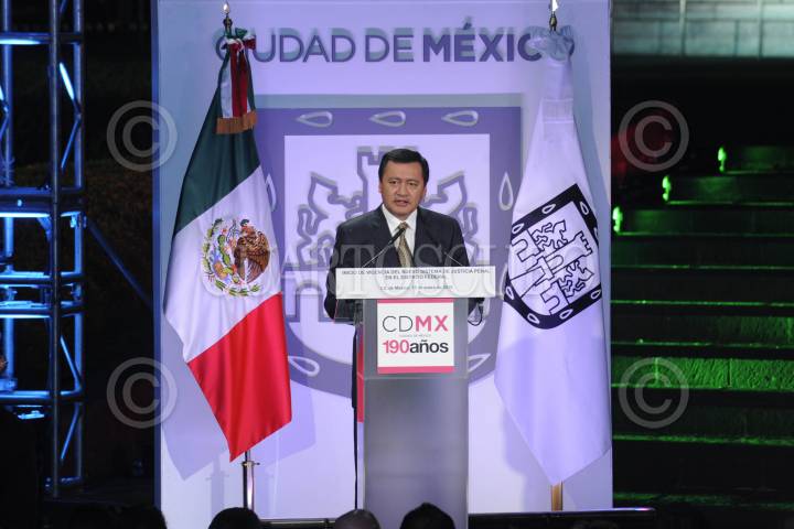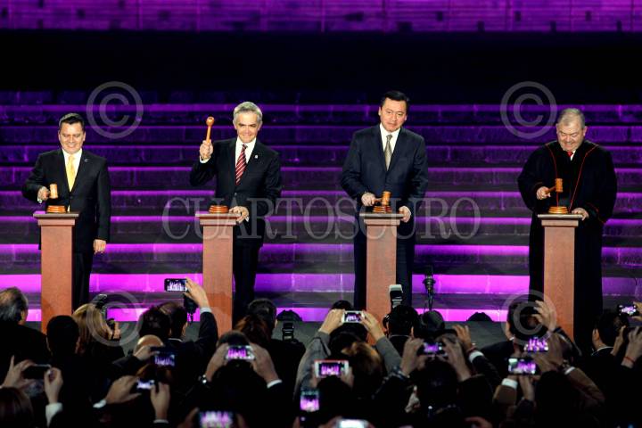 MÉXICO D. F., 16ENERO2015.- A las 00:00 Hrs de este Viernes, entro en vigor el nuevo Sistema de Justicia Penal Acusatorio, Con Mazo en mano, el Secretario de Gobernación Miguel Ángel Osorio Chong, el Jefe de Gobierno Miguel Ángel Mancera, el Presidente del Tribunal Superior de Justicia del Distrito Federal Edgar Elías Azar y el Presidente de la Comisión de Gobierno de la Asamblea Legislativa Manuel Granados Covarrubias, dieron el martillazo de inicio frente al monumento a la Patria, ubicado en la entrada al Castillo de Chapultepec. FOTO: LUIS CARBAYO /CUARTOSCURO.COM
