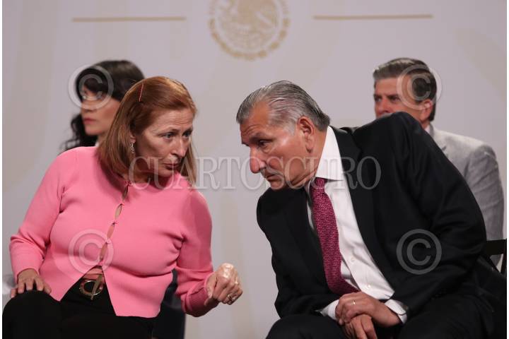 Adán Augusto López Hernández, secretario de Gobernación y Rosa Icela Rodríguez Velázquez, secretaria de Seguridad y Protección Ciudadana durante conferencia de prensa en Palacio Nacional.