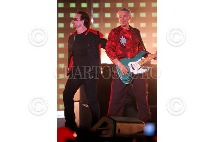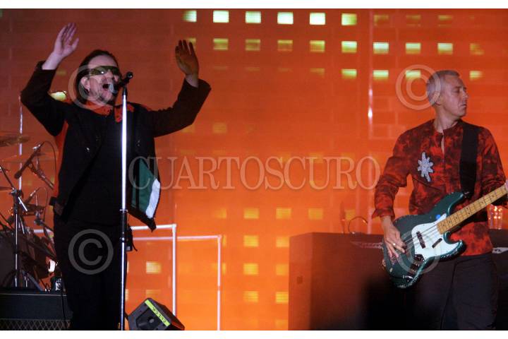 MEXICO D.F. 16FEBERO2006.- El cantante Bono junto con el bajista Adam Clayton, durante el primer concierto que ofreciò la banda irlandesa U2, en el Estadio Azteca. FOTO: CUARTOSCURO.COM