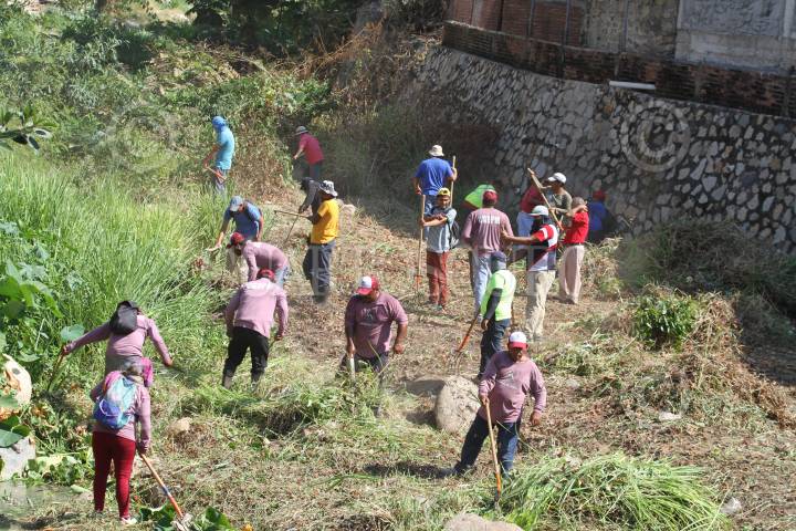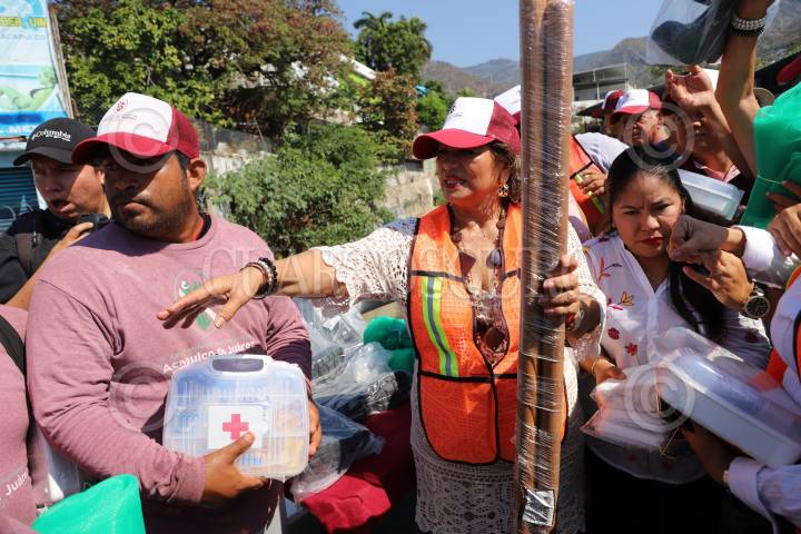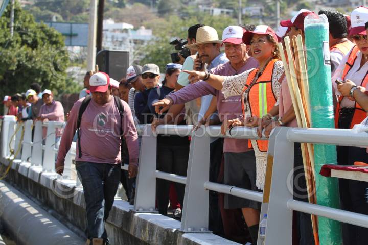 ACAPULCO, GUERRERO, 10MARZO2019.- Adela Roman, alcaldesa de Acapulco, dio inicio a la limpieza de canales pluviales y ramales previo a la temporada de lluvias y huracanes 2019, en busca de prevenir inundaciones y garantizar la seguridad de las familias acapulqueñas, en la cual participaron más 400 personas con una inversión de 9 millones de pesos. En el puente del río del Camarón, sobre la avenida Constituyentes, la presidenta municipal Román Ocampo hizo un llamado a la ciudadanía a contribuir con los gobiernos y mantener una ciudad más limpia. En este sitio la alcaldesa realizó la entrega simbólica del material al personal del Ayuntamiento como son 300 botas plásticas, 150 machetes, 300 fajas, 300 impermeables, 8 botiquines, 5 garrafas de 20 litros de alcohol, garrafones de agua, 300 arañas, mil piezas de cubrebocas entre otros artículos. FOTO: BERNANDINO HERNÁNDEZ /CUARTOSCURO.COM