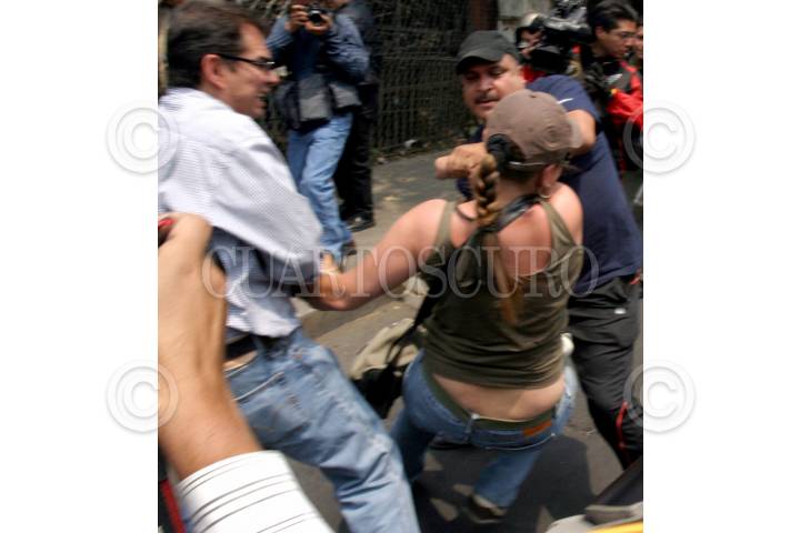 MÉXICO, D.F., 17ABRIL2008.- Una mujer pertenenciente a el grupo de las adelitas fue desalojada al intentar impedir el paso del autobus donde viajaban los senadores que se dirigian hacia el senado ubicado en la calle Xicotencatl. FOTO: PEDRO MARRUFO/CUARTOSCURO.COM
