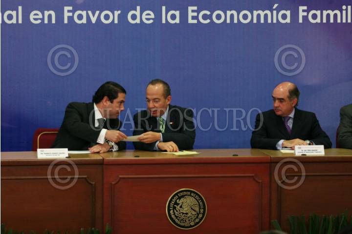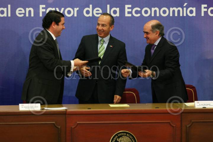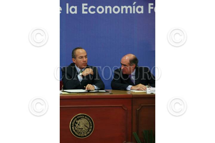 MÉXICO D.F., 20ENERO2009.- Felipe Calderón Hinojosa, presidente de México, encabezo la ceremonia y fungió como testigo de honor de la firma de adhesión de la Cadena Productiva de la Industria de la Construcción al Acuerdo Nacional a favor de la Economía Familiar y el Empleo para Vivir Mejor, esto en la Residencia Oficial de los Pinos. En la imagen el mandatario es acompañado por Alonso García Tames Director General del Banco de Obras y Servicios Públicos y Luis Tellez Kuenzler, Secretario de Comunicaciones y Transportes. FOTO: GUILLERMO PEREA/CUARTOSCURO.COM