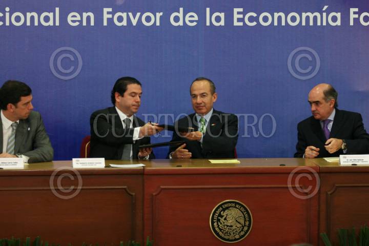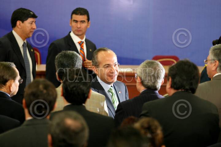 MÉXICO D.F., 20ENERO2009.- Felipe Calderón Hinojosa, presidente de México, encabezo la ceremonia y fungió como testigo de honor de la firma de adhesión de la Cadena Productiva de la Industria de la Construcción al Acuerdo Nacional a favor de la Economía Familiar y el Empleo para Vivir Mejor, esto en la Residencia Oficial de los Pinos. FOTO: GUILLERMO PEREA/CUARTOSCURO.COM