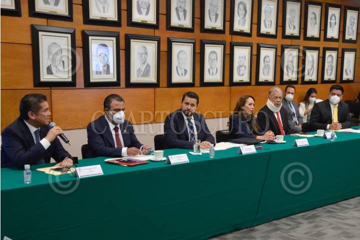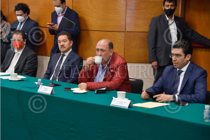 Reginaldo Sandoval, diputado del PT; junto a los coordinadores: Ignacio Mier (Morena); Rubén Moreira (PRI) y Jorge Romero (PAN), durante la reunión con Armando Tejeda Cid, diputado del PAN, quien fue elegido como presidente del comité de administración de la Cámara de Diputados.