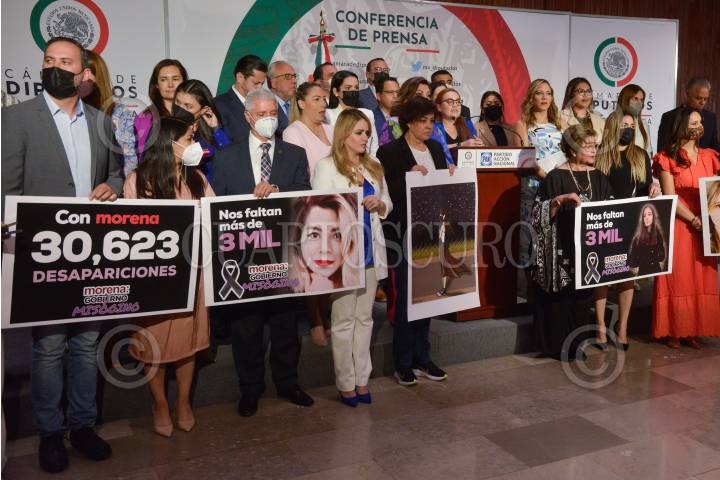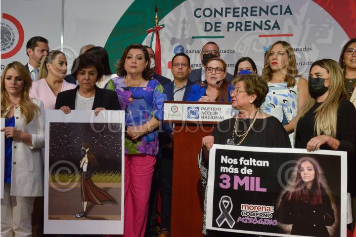 Annia Sarahí Gómez, diputada del PAN, e integrantes del mismo grupo parlamentario, ofrecieron conferencia de prensa para exigir justicia por las víctimas de feminicidio y desapariciones de mujeres durante las recientes administraciones de Morena.