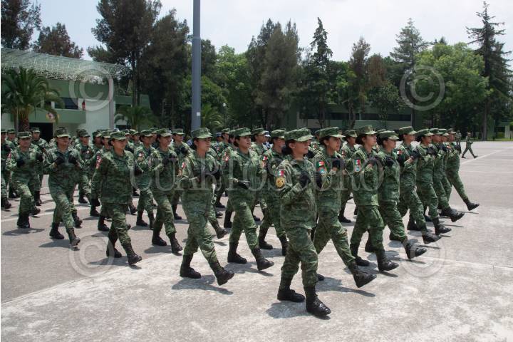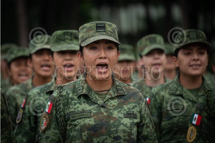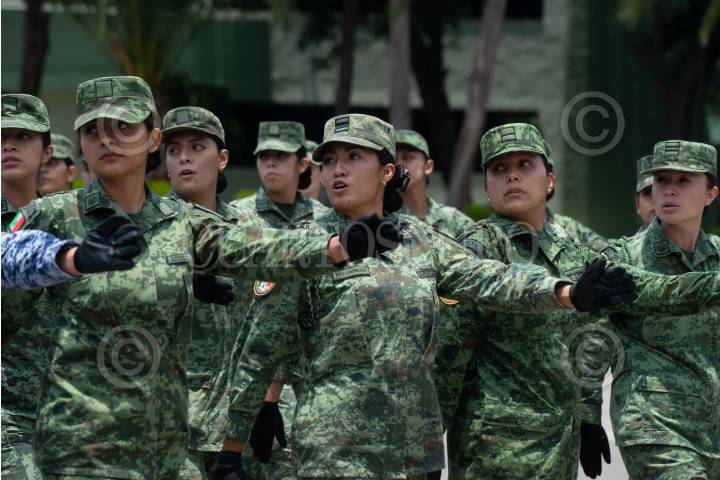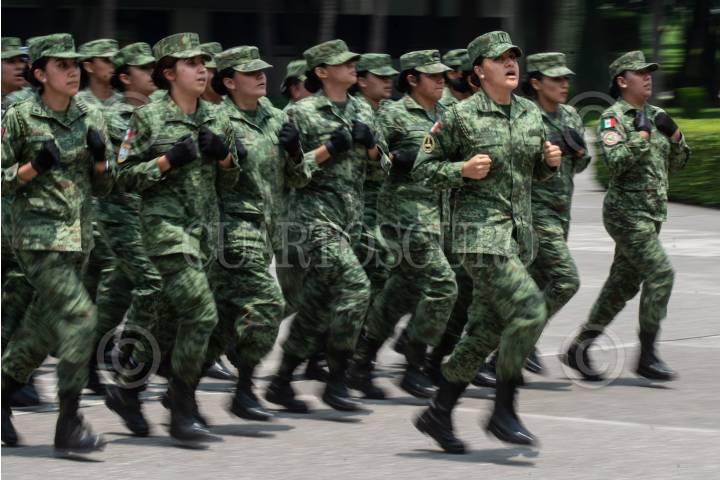 Mujeres integrantes del Batallón de Tropas de Administración Femenino de la Secretaría de la Defensa Nacional (SEDENA) continúan con las prácticas diarias para el desfile militar del 212 aniversario de la Independencia de México.