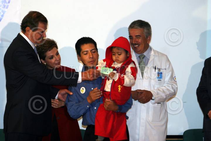 MEXICO, D.F. 06ENERO2005.- El presidente Vicente Fox y su esposa Marta Sahagún entregan una credencial de seguro popular a un niño con cáncer, durante la ceremonia de La Prevención y el Tratamiento de Cáncer en la Infancia y la Adolescencia que se llevó a cabo en el Hospital Infantil de México. FOTO: Nelly Salas/CUARTOSCURO.COM