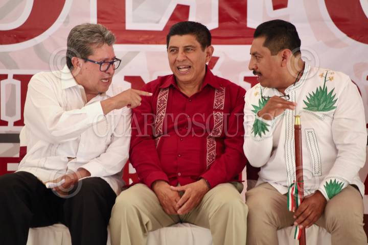 Ricardo Monreal y Salomón Jara durante el informe de actividades legislativas en la Plaza de la Danza en la capital del estado de Oaxaca.