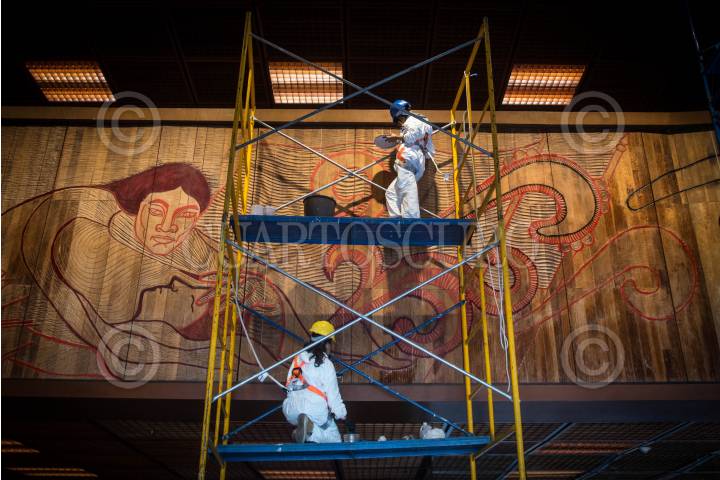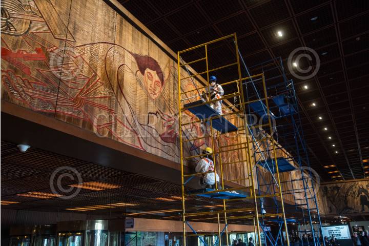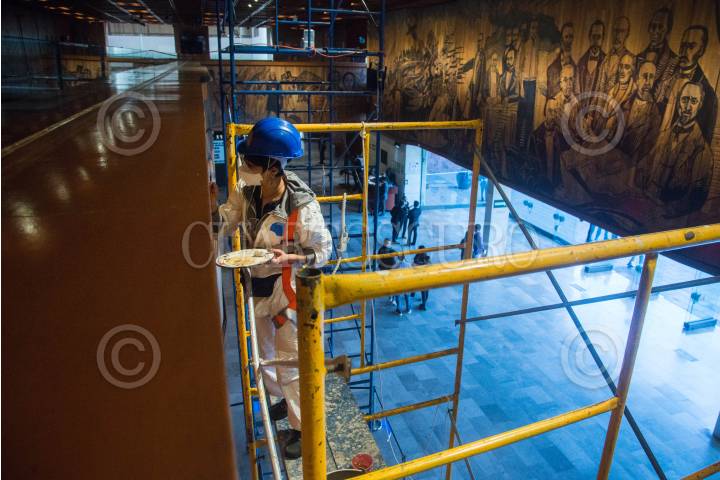 Especialistas realizan trabajos de restauración del mural “Las constituciones de México” de Adolfo Mexiac ubicado en el vestíbulo del Palacio Legislativo de San Lázaro.