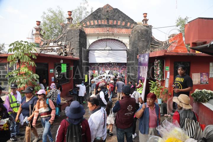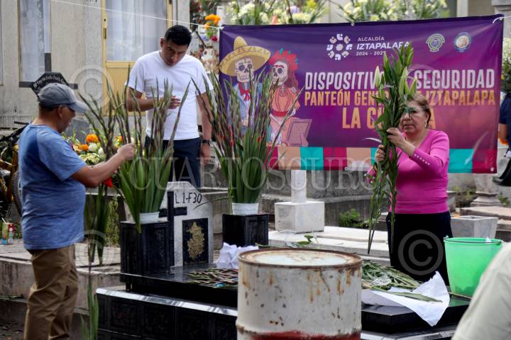CIUDAD DE MÉXICO, 01NOVIEMBRE2024. En panteones de la demarcación Iztapalapa, habitantes comienzan la limpieza y adorno de las tumbas previo a la celebración de Día de Muertos. Elementos de seguridad pública así como de protección civil se encuentran en las entradas para resguardar el orden en el cementerio. FOTO: EDGAR NEGRETE LIRA/CUARTOSCURO.COM