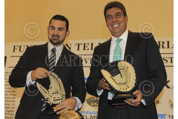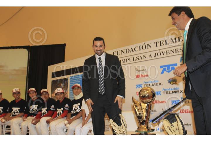 MÉXICO, D.F., 29ENERO2015.- El beisbolista mexicano Adrián González, y Arturo Elías Ayub, director de Fundación Telmex, presentaron la nueva edición de la Liga infantil Telmex de beisbol homónima del pelotero de los Dodgers de Los Ángeles. FOTO: ISAAC ESQUIVEL /CUARTOSCURO.COM