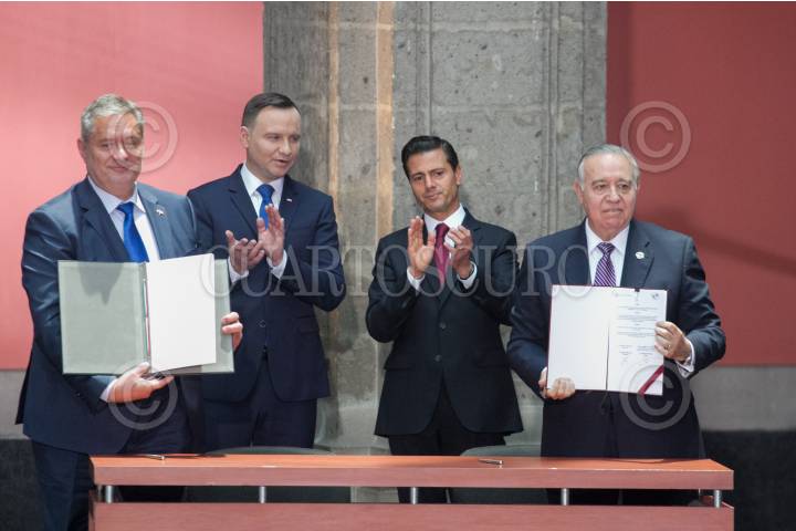 CIUDAD DE MÉXICO, 24ABRIL2017.- Adrzej Duda, Presidente de Polonia, y Enrique Peña Nieto, Presidente de México, hicieron una declaración conjunta "Hacia una relación estratégica entre México y Polonia", en el Palacio Nacional. En la imagen se aprecian también a; Janusz Wisniewaki, vicepresidente de la Cámara de Comercio de Polonia (KIG), y Valentín Diez Morodo, presidente de Consejo Empresarial Meicano de Comercio Exterior, Inversión y Tecnología (COMCE). FOTO: MOISÉS PABLO /CUARTOSCURO.COM