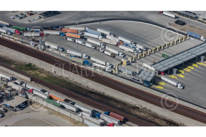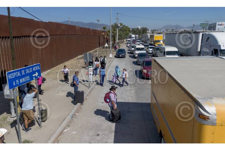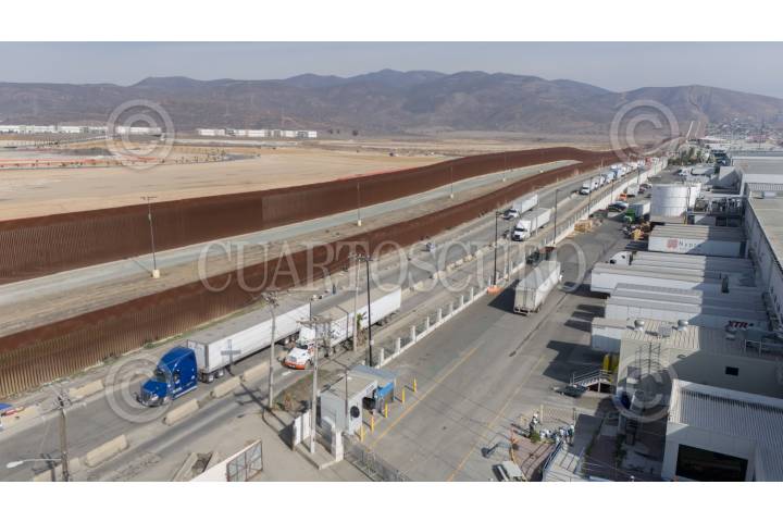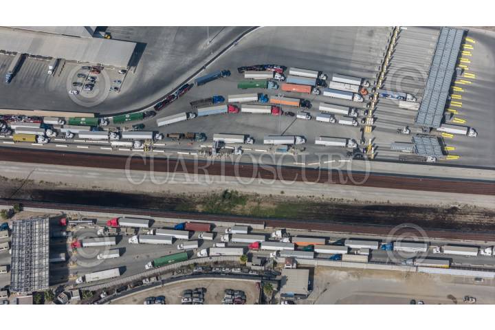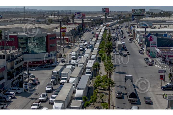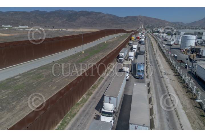 TIJUANA BAJA CALIFORNIA 31ENERO2025.- Fila de tractocamiones en el acceso a la garita aduana de Otay Mesa. Estados Unidos dio a conocer a través de la portavoz de la Casa Blanca, Karoline Leavitt, que a partir del 1 de febrero, podría aplicar aranceles del 25% a productos importados de México. Esta medida forma parte de la estrategia del presidente Donald Trump para presionar a México a frenar la violencia y el tráfico de droga. La implementación de estos aranceles puede generar un aumento en los precios de productos importados y afectar tanto a consumidores como a empresas estadounidenses que dependen de insumos provenientes de México. FOTO: OMAR MARTÍNEZ/CUARTOSCURO.COM