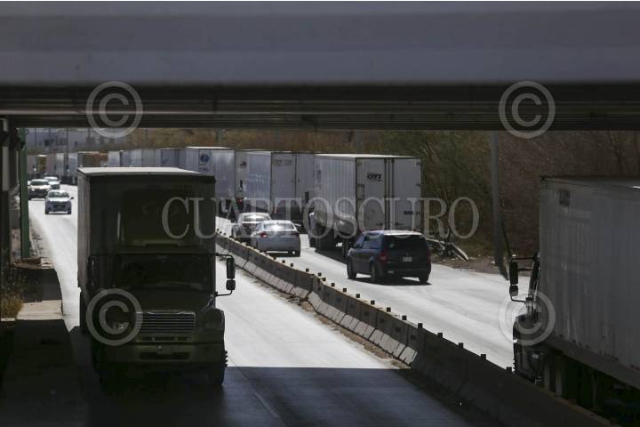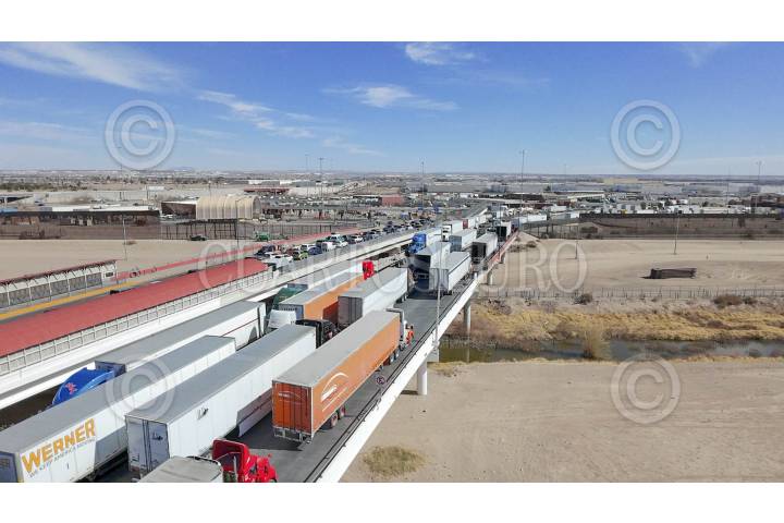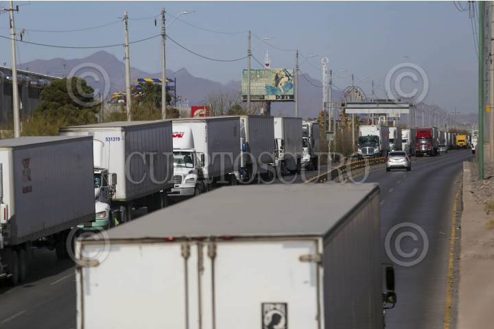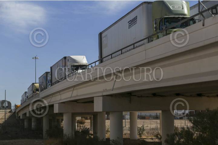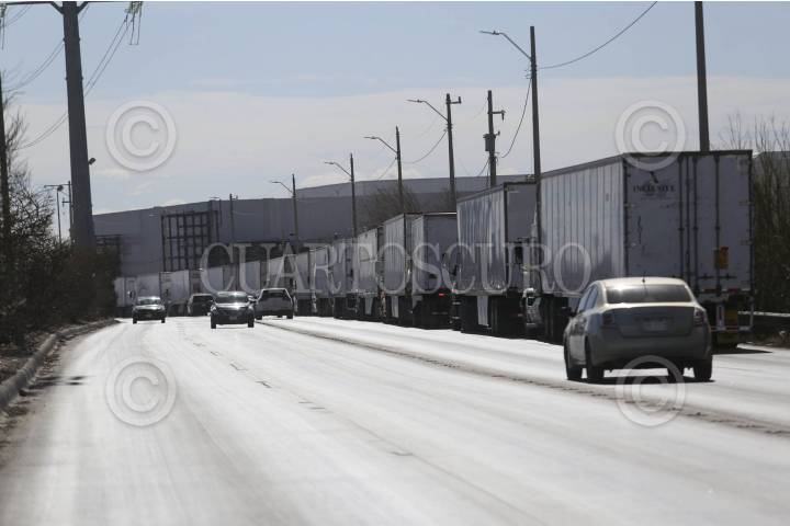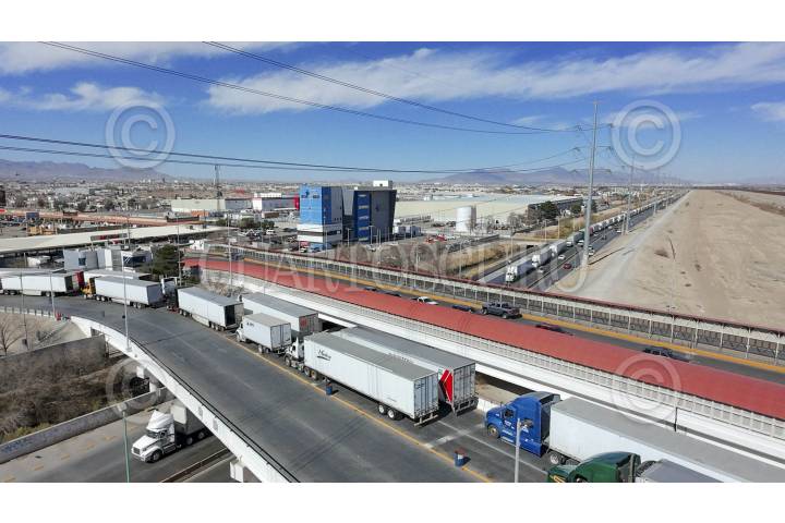 CIUDAD JUÁREZ, CHIHUAHUA, 11FEBRERO2025.- Este martes, se han registrado filas kilométricas de tráileres en el puente internacional Zaragoza-Ysleta, en Ciudad Juárez, debido a fallas en el sistema de la aduana de Estados Unidos. Transportistas han reportado tiempos de espera prolongados, lo que ha generado caos vial en la zona. La fila de camiones se extiende por el bulevar Juan Pablo II y otras vialidades, afectando la movilidad en distintos puntos de la ciudad. Agentes de seguridad vial han sido desplegados para mitigar el impacto del congestionamiento. Esta situación ha generado preocupación entre los transportistas, no solo por los retrasos, sino también por el aumento en los aranceles impuestos por el presidente de EE.UU., Donald Trump. Hasta el momento, las autoridades no han emitido un comunicado oficial sobre el problema. FOTO: CARLOS SÁNCHEZ COLUNGA/CUARTOSCURO.COM