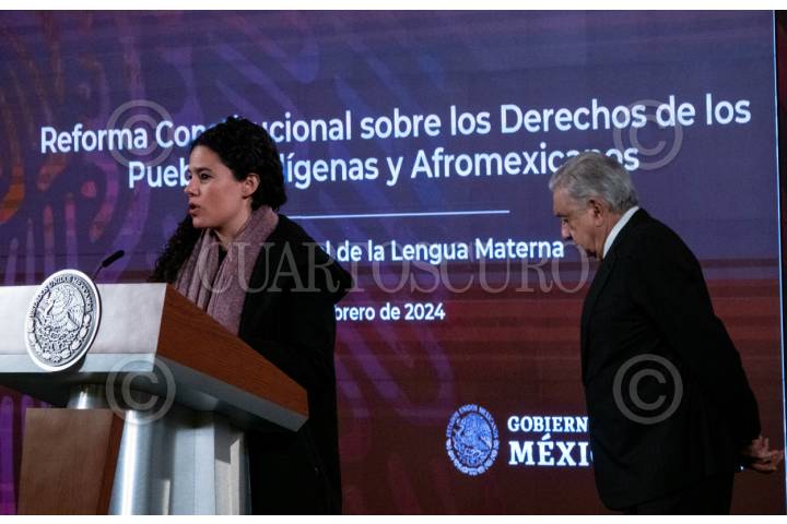 CIUDAD DE MÉXICO, 21FEBRERO2024.- Luisa María Alcalde, secretaria de Gobernación, y Andrés Manuel López Obrador, presidente de México, durante la conferencia matutina en que se expusieron los puntos de la Reforma Constitucional sobre los Derechos de los Pueblos Indígenas y Afromexicanos. FOTO: GALO CAÑAS/CUARTOSCURO.COM