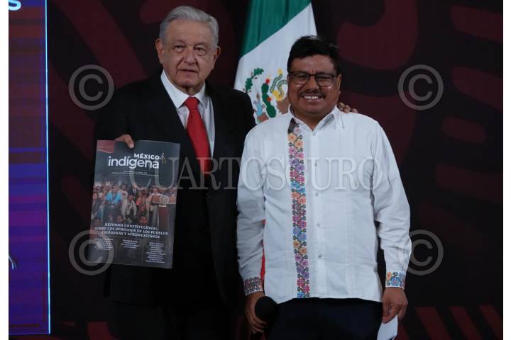 CIUDAD DE MÉXICO, 21FEBRERO2024.- Andrés Manuel López Obrador, presidente de México, y delfo Regino Montes, director general del Instituto Nacional de los Pueblos Indígens (INPI), durante la conferencia matutina en que se expusieron los puntos de la Reforma Constitucional sobre los Derechos de los Pueblos Indígenas y Afromexicanos, así como la sección de "Quién es quién en las mentiras de la semana". FOTO: GALO CAÑAS/CUARTOSCURO.COM