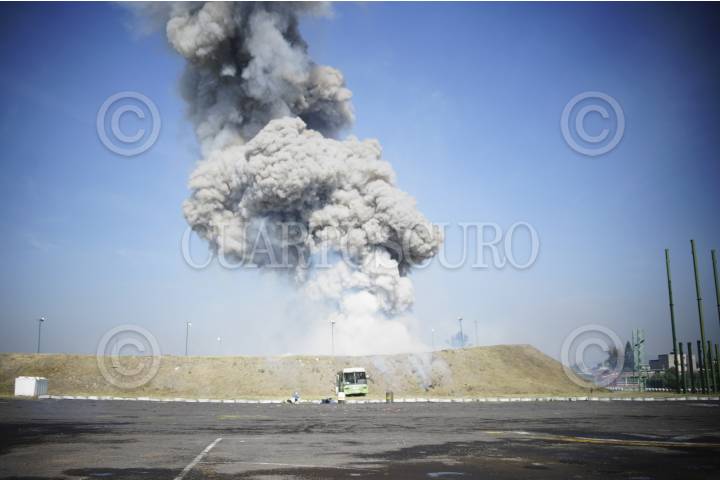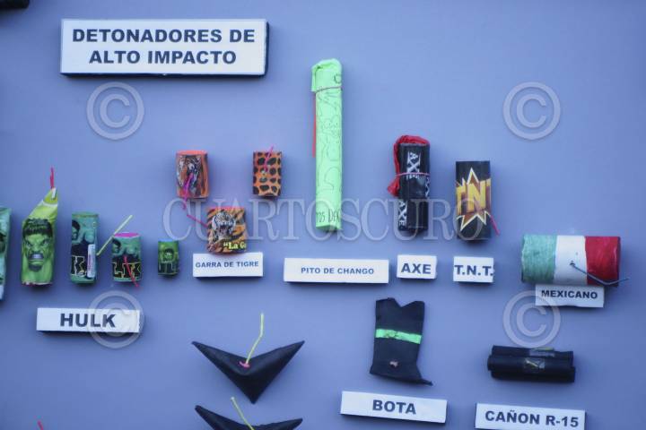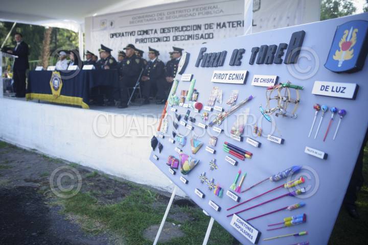 MÉXICO, D.F., 16OCTUBRE2013.- La SSPDF (Secretaría de Seguridad Pública del D.F. conmemoró la destrucción de material pirotécnico. Se aseguraron cerca de 5 mil toneladas de fuegos pirotécnicos con distintas cantidades de pólvora la cuales varían según su potencia en la explosión. Dichos productos son usados en su mayoría por niños quienes no lo hacen bajo la supervisión de un adulto lo que puede resultar tragedias como, perdidas de miembros, desfiguraciones y graves quemaduras. Asistieron el Secretario de Seguridad Pública quien se presentó en muletas, FOTO: ALEJANDRO NEYRA /CUARTOSCURO.COM