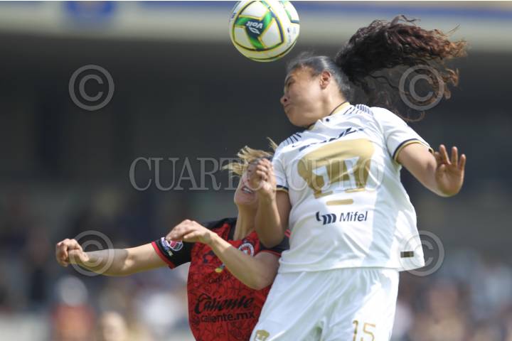 Adyson Willett de Xolas y Marylín Díaz de Pumas pelean un balón aéreo durante partido de fútbol Pumas vs Tijuana correspondiente a la jornada 6 del Torneo Clausura 2023 de Liga BBVA MX Femenil, en el Estadio Olímpico Universitario.