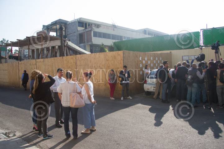 CIUDAD DE MÉXICO, 15MAYO2018.- En las afueras del Colegio Enrique Rebsamen, donde murieron niños y profesores, se encuentra abandonado desde hace meses. Este día del maestro acudieron familiares de los fallecidos, algunos profesores y medios de comunicación también dos aspirantes al gibierno de la Ciudad, Purificación Carpinteyro y Alejandra Barrales. FOTO: VICTORIA VALTIERRA / CUARTOSCURO.COM
