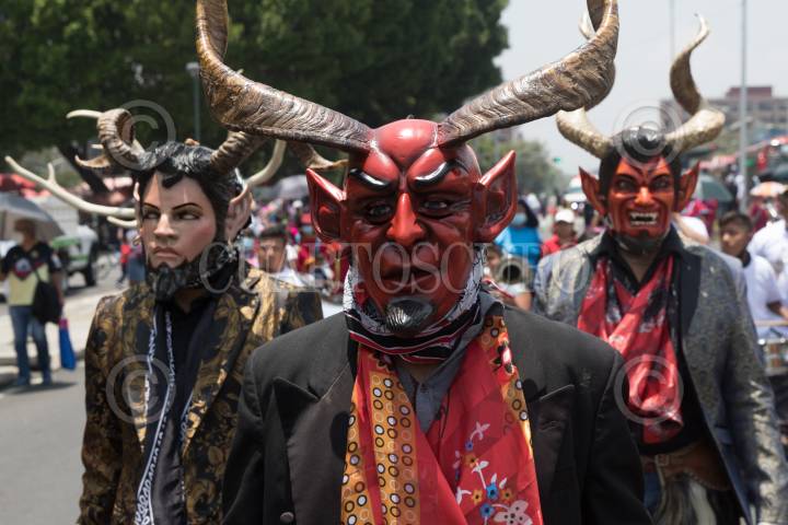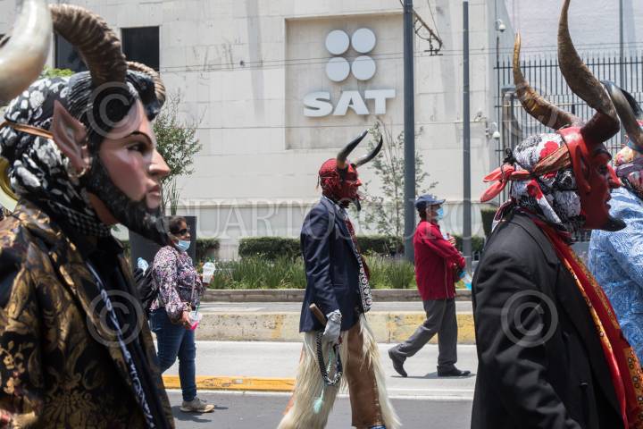 Jóvenes disfrazados de diablos durante la 12a Jornada por la Visibilización de la Presencia Indígena y Afromexicana, pasan frente a las oficinas del Sistema de Administración Tributaria (SAT).