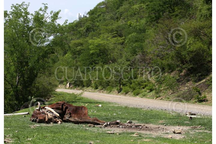 TLAQUILTENANGO, MORELOS 21JULIO2024.- Vida cotidiana en la Sierra de Huautla, el cadáver de una res yace a lado del camino que comunica los poblados de La Era y Los Elotes. FOTO: MARGARITO PÉREZ RETANA/CUARTOSCURO.COM