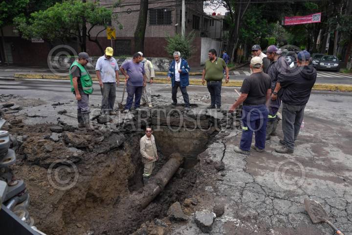 CIUDAD DE MÉXICO 18JUNIO2025.- Luego de una fuerte fuga de agua potable, trabajadores de la alcaldía realizaron las labores de reparación en tubos dañados en Eje 6 y la calle Atlanta en de la alcaldía Benito Juárez. FOTO:ROGELIO MORALES /CUARTOSCURO.COM