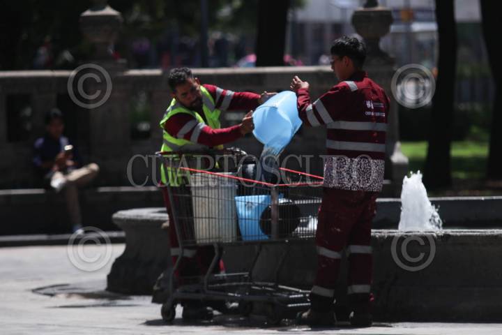 CIUDAD DE MÉXICO, 29JULIO2025.- Trabajadores de limpieza suministran cubetas de agua de una de las fuentes de la Alameda Central. FOTO: GRACIELA LÓPEZ/CUARTOSCURO.COM