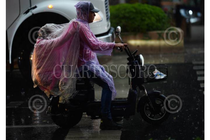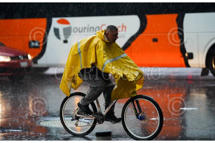CIUDAD DE MÉXICO, 10AGOSTO2025.- Una intensa lluvia sorprendió a los capitalinos que recorrían la zona centro durante esta tarde de domingo. En la imagen un ciclista intenta cubrirse de la lluvia. FOTO: GALO CAÑAS/CUARTOSCURO.COM