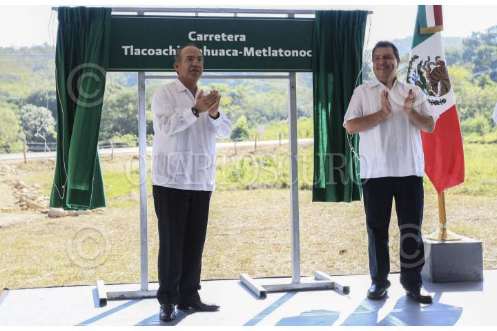 TLACOACHISTLAHUACA, GUERRERO., 19NOVIEMBRE2012.- Felipe Calderón Hinojosa, presidente de México, acompañado de Ángel Aguirre, Gobernador del Estado; durante la inauguración de la carretera Tlacoachistlahuaca-Metlatonoc, con un tramo 0 al kilometro 62 y 91 al kilometro 100. FOTO: ALFREDO GUERRERO /CUARTOSCURO.COM
