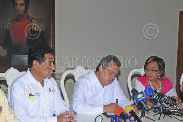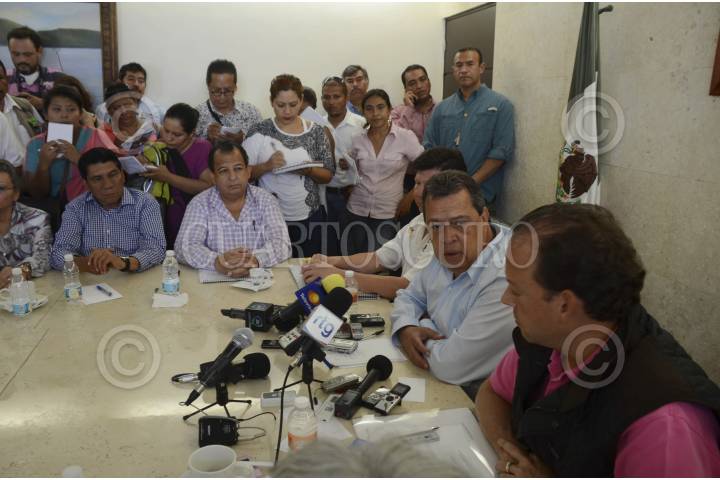 ACAPULCO, GUERRERO, 08OCTUBRE2013.- El gobernador Ángel Aguirre Rivero, acompañado de Davit Koifel y Arturo Palma director de Cafapet, informaron que actualmente la Comisión de Agua Potable y Alcantarillado del Municipio de Acapulco surte 2 mil 450 litros por segundo al puerto, y se espera que llegue a surtir hasta 5 mil litros por segundo la próxima semana, aunado al funcionamiento de 100 pipas con las que cuentan para repartir el vital liquido en la periferia. FOTO: BERNANDINO HERNÁNDEZ /CUARTOSCURO.COM