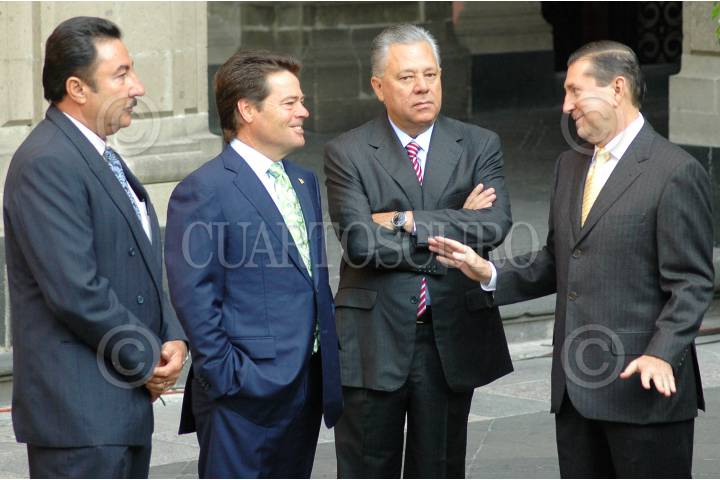 MÉXICO, D.F., 15MAYO2008.- Los gobernadores de Baja California Sur, Narciso Agúndez Montaño; Sonora, Eduardo Bours; Sinaloa, Jesús Aguilar Padilla ; Guerrero, Zeferino Torre Blanca; momentos antes del evento de calidad educativa para vivir mejor que se realizo en el patio central de Palacio Nacional. FOTO: RODOLFO ANGULO/CUARTOSCURO.COM