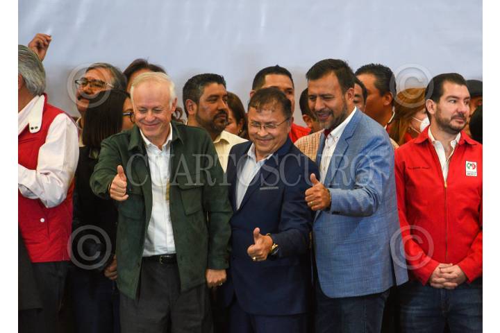 Jesús Zambrano, líder nacional del PRD, Alejandra del Moral candidata a la gubernatura del Estado de México por la coalición “Va por el Estado de México”, Omar Ortega diputado local, Agustin Barrera líder estatal durante el festejo del 34 Aniversario del PRD.