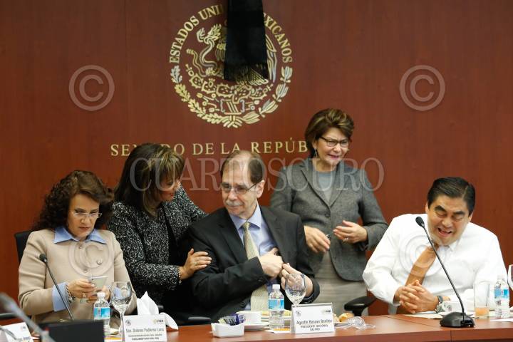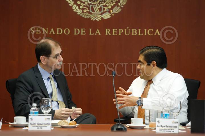 MÉXICO, D.F., 03DICIMEBRE2015.- Agustín Basave Benítez, presidente del PRD, y Miguel Barbosa, coordinador de los senadores perredistas, durante una reunión con la bancada amarilla en el Senado. FOTO: CUARTOSCURO.COM