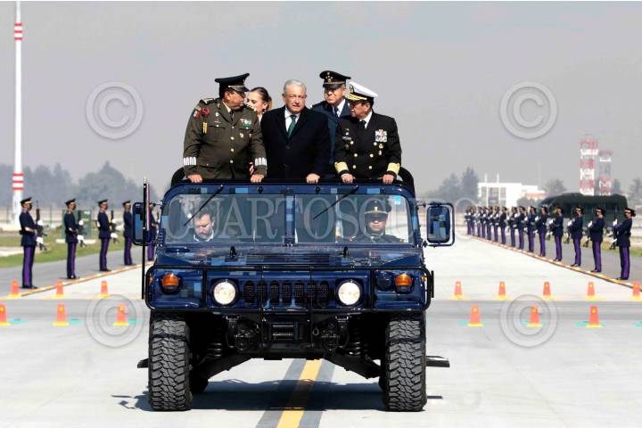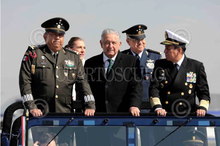 Agustín Radilla Suastegui, Subsecretario de la Defensa Nacional; Andrés Manuel López Obrador, Presidente de México, y José Luis Arellano Ruiz, Subsecretario de Marina, durante la ceremonia del Día de la Fuerza Aérea Mexicana.