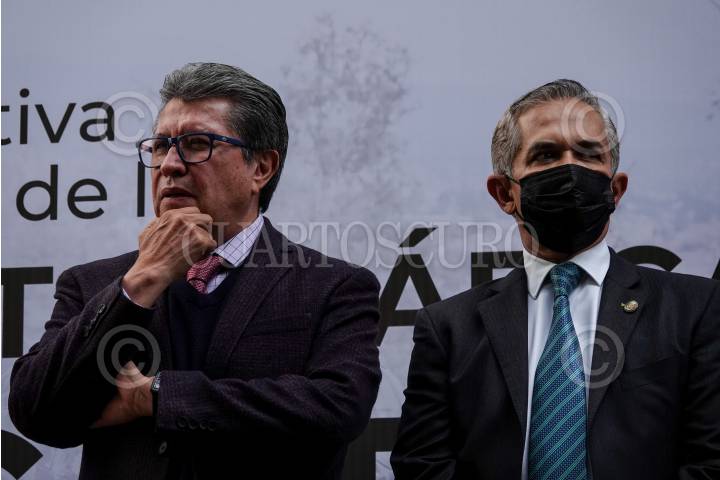 Ricardo Monreal y Miguel Ángel Mancera durante la inaugurcación de la exposición fotográfica Ejército y Fuerza Aérea, más cerca de ti” en el Senado de la República.