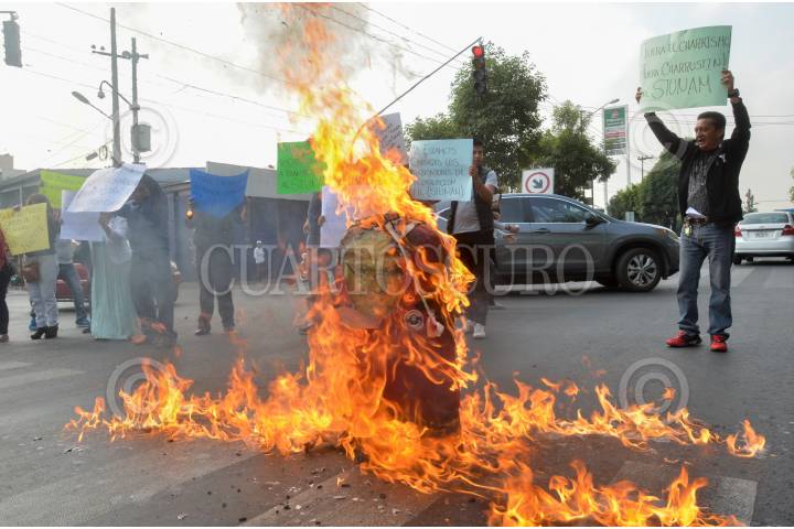 CIUDAD DE MÉXICO, 06ABRIL2017.- Trabajadores de la Preparatoria 7, ubicada en la Viga y Zoquila, protestaron por no estar de acuerdo con el proceder su líder sindical del STUNAM, Agustín Rodríguez, los inconformes quemaron una muñeco de papel con la foto de su representante. FOTO: ARMANDO MONROY /CUARTOSCURO.COM
