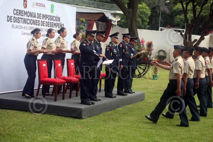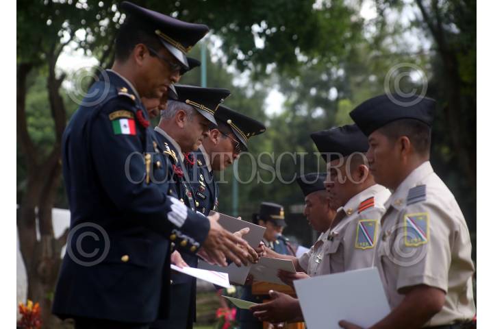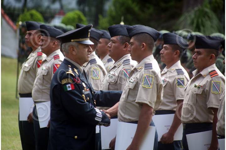 CUERNAVACA, MORELOS, 23AGOSTO2019. Ceremonia de Imposición de Distinciones de Desempeño a soldados por su trabajo en el Plan DNIII-E, operaciones y adiestramiento en la XXIV Zona Militar. El comandante de la zona, Agustín Vallejo, acompañado de generales de regimientos presidio la entrega. FOTO: MARGARITO PÉREZ RETANA /CUARTOSCURO.COM