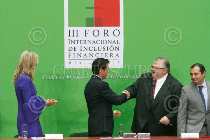 CIUDAD DE MÉXICO, 07SEPTIEMBRE2017.- El Gobernador de México Agustín Carstens Carstens recibió un reconocimiento durante la inauguración del Tercer Foro Internacional de Inclusión Financiera, en el Palacio Nacional. FOTO: MOISÉS PABLO /CUARTOSCURO.COM