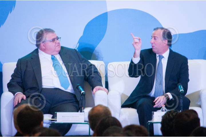 CIUDAD DE MÉXICO, 07SEPTIEMBRE2017.- Agustín Carstens Carstens, Gobernador del Banco de México, conversa con Guillermo Ortiz, ex secretario de Hacienda, durante la inauguración del Tercer Foro Internacional de Inclusión Financiera, en el Palacio Nacional. FOTO: MOISÉS PABLO /CUARTOSCURO.COM