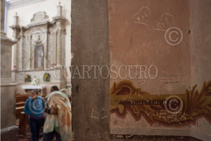 JALPAN DE SERRA, QUERETARO. 07ENERO2012.- La misión de Jalpan de Serra, iglesia construida en 1744 por la orden de los Agustinos y declarada Patrimonio de la Humanidad (2003), presenta daños en su interior, pues desde hace tiempo no se le da mantenimiento. Los vecinos exhortan a no rayar y destruir el inmueble que es símbolo del barroco mexicano y atractivo turístico del lugar, declarado "Pueblo mágico" desde 2010. FOTO: DEMIAN CHAVEZ/CUARTOSCURO.COM