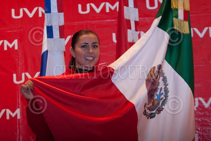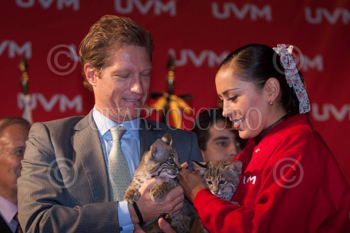 MÉXICO, D.F., 14AGOSTO2012.- El Maestro Dieter Holtz Wedde, Director General de la Universidad del Valle de México y la Arquera Aída Román, medalla de Plata en los pasados Juegos Olímpico de Londres 2012, presentaron ante los medios de comunicación a los Linces "Aída" y "Román" mascotas de la Institución. La medallista fue homenajeada en su "Alma Mater" además de que se fundo la beca "Aída Román" FOTO: FRANCISCO RODRÍGUEZ /CUARTOSCURO.COM
