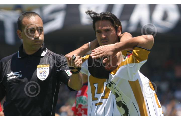 MÉXICO, D.F. 18 ABRIL 2004.- Cero a cero fue el resultado final en juego de la jornada 15 del torneo de clausura 2004 entre los Pumas de la UNAM y los Freseros de Irapuato. En la gráfica el árbitro del encuentro Mauricio Rafael Morales, Ailton da Silva, (pumas). FOTO: Iván Stephens/CUARTOSCURO.COM