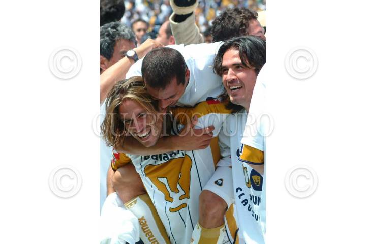 MEXICO, D.F. 20ENERO2005.- Los bicampeones Pumas de la UNAM se tomaron la fotografía del recuerdo en el inicio de la temporada del torneo de clausura 2005, en el estadio de Ciudad Universitaria. En la gráfica Bruno Marioni, Diego Alonso (arriba), Ismael Iñiguez, Joaquín Botero y Ailton Da Silva. FOTO: Iván Stephens/CUARTOSCURO.COM