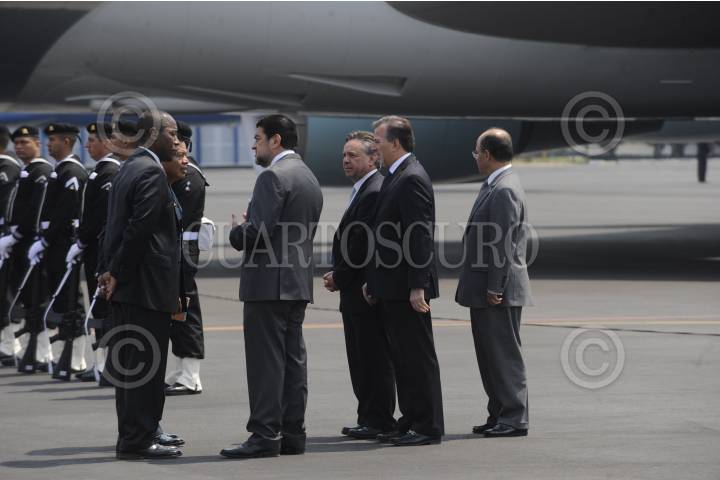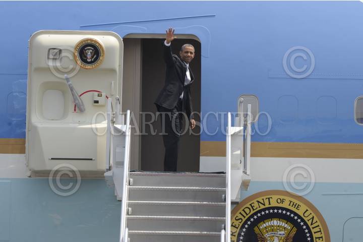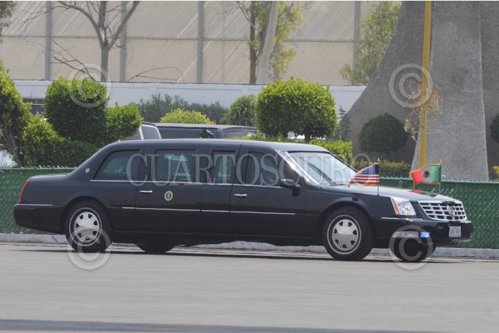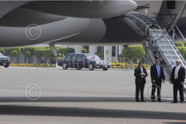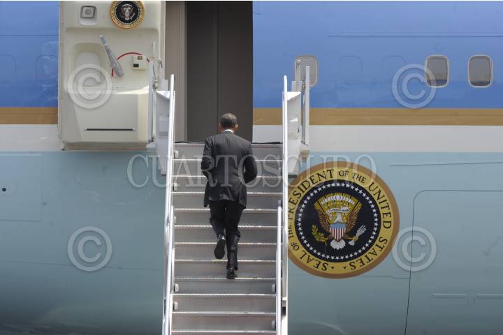 MÉXICO, D.F., 03MAYO2013.- El Presidente de los Estados Unidos Barack Obama dejó tierras mexicanas pasado el medio día con rumbo a Costa Rica, esto tras concluir su encuentro con jóvenes en el Museo de Antropología. El mandatario estadounidense llegó en su popular limusina "La Bestia" y fue despedido por el embajador Eduardo Medina Mora, y el canciller José Antonio Meade, en el Hangar Presidencial en donde abordó del Air Force One. FOTO: IVÁN MENDEZ /CUARTOSCURO.COM