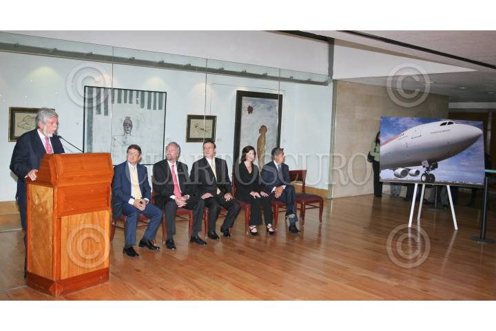 MÉXICO, D.F., 06SEPTIEMBRE2010.- Manuel Alabart, Embajador de España en México; Manuel Antonio López Aguilar, director general de Iberia; Héctor Velázquez, director general del Aeropuerto Internacional Benito Juárez de la Ciudad de México; Marcelo Ebrard Casaubón, Jefe de Gobierno del Distrito Federal; Jacqueline Arzoz Padrés, Subsecretaria de Planeación Turística de la Secretaría de Turismo y Alejandro Rojas Díaz-Duran, secretario de turismo del Distrito Federal; durante un mensaje a los medios de comunicación para informar el bautizo del nuevo avión Airbus A340-600 de la aerolínea Iberia el cual porta el nombre de "Ciudad de México" y realizará viajes España-México-España. Esto se realizó hoy 6 de septiembre de 2010 en el Aeropuerto Internacional Benito Juárez de la Ciudad de México. FOTO: MISAEL VALTIERRA/CUARTOSCURO.COM
